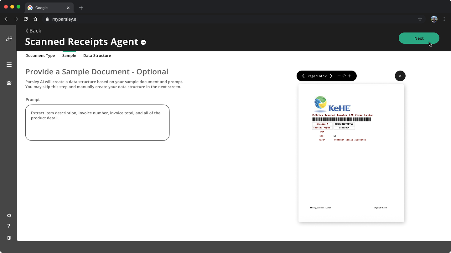 Upload a sample document with your desired output and add real language business rules